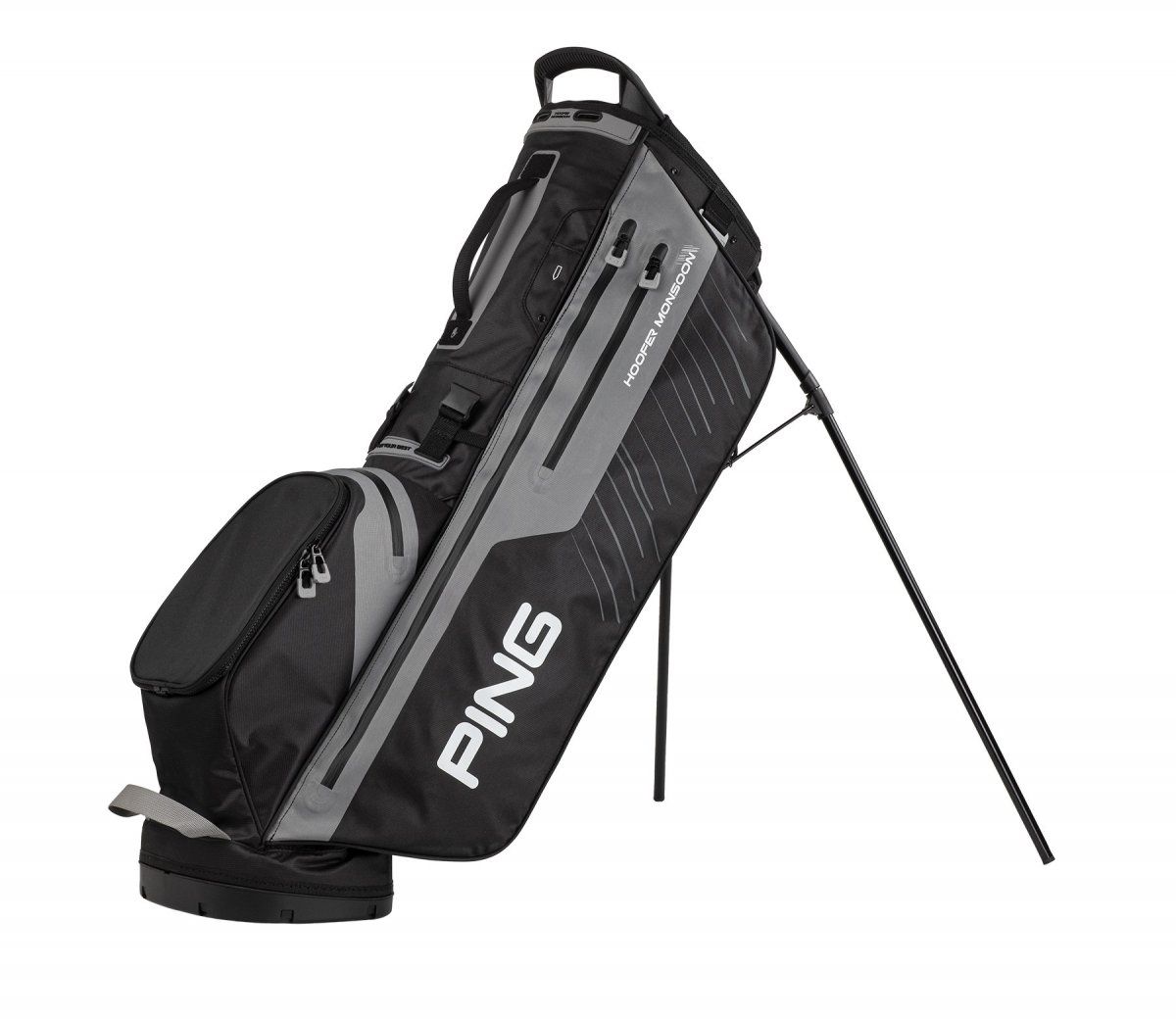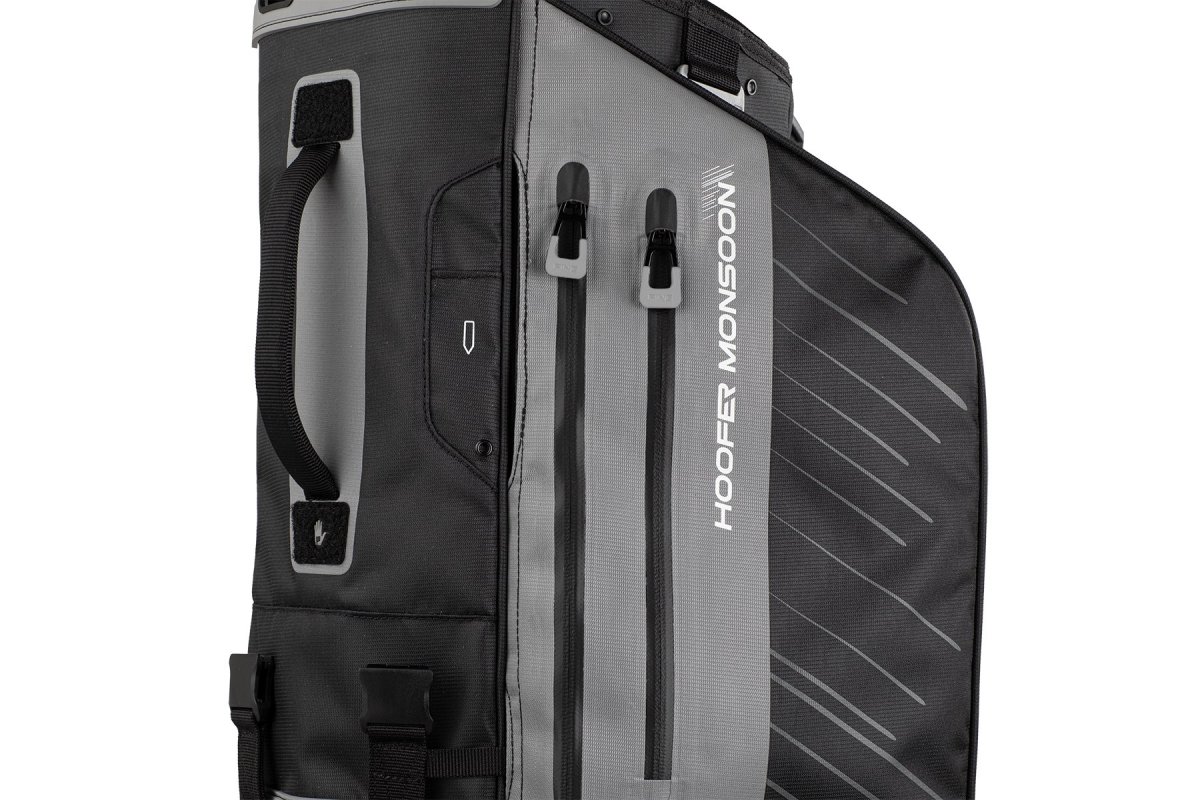 Featuring a highly innovative waterproof construction and four seam-sealed pockets (eight altogether), the lightweight and rugged Hoofer Monsoon bag stands ready, rain or shine. A deployable rain hood protects your clubs inside a rigid five-way top. Even the easy-adjusting, sliding shoulder pads feature SensorDry® Technology, to wick moisture away and keep you comfortable.