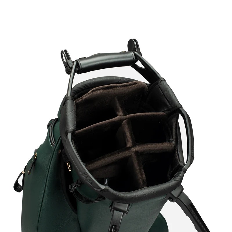 Experience the pinnacle of luxury performance with the Player V Pro. Meticulously crafted for the highest level of functionality and on-course convenience. The newly designed 7-and-14 way tops offer best in class club organization with dedicated putter storage and offset club dividers for optimal club viewing and retrieval. The Player V Pro utilizes VESSEL’s patented technologies (Equilibrium Double Strap and Rotator Base) for maximum balance and superior stability. Intentionally placed high strap-attachment points promote further balance and eliminate club fallout while the bag is being carried. A key feature is the cart strap pass-through for added protection when used on a cart or trolley. With too many fine details to name, you’ll be pleasantly surprised to discover that every detail, every element, of the Player V Pro is thoughtfully crafted for an uncompromised game.
