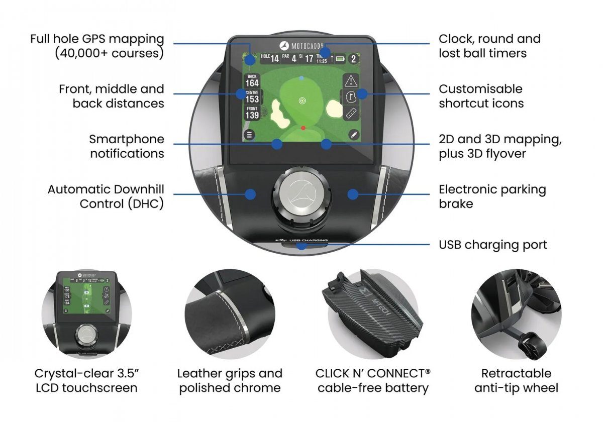 Packed with technology that enhances your game, it delivers high-performance GPS through a responsive and crystal-clear 3.5" touchscreen. The distinctive design is inspired by the automotive industry and features new 10-spoke tyres, complemented by hand-stitched premium leather handle grips, polished chrome detailing, and carbon fibre-inspired styling for a truly premium look and feel.